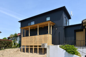 張り出したウッドデッキは木目で優しい、家族の集いの場